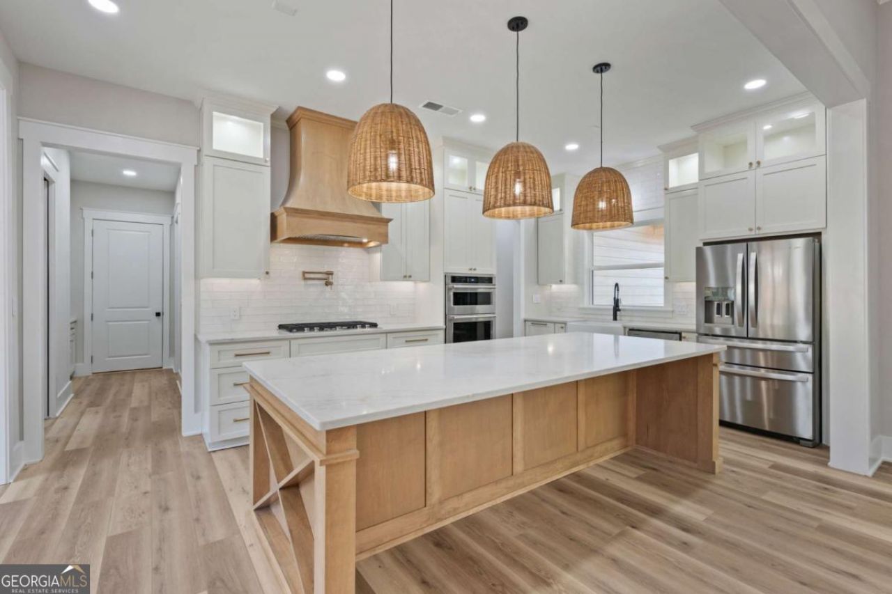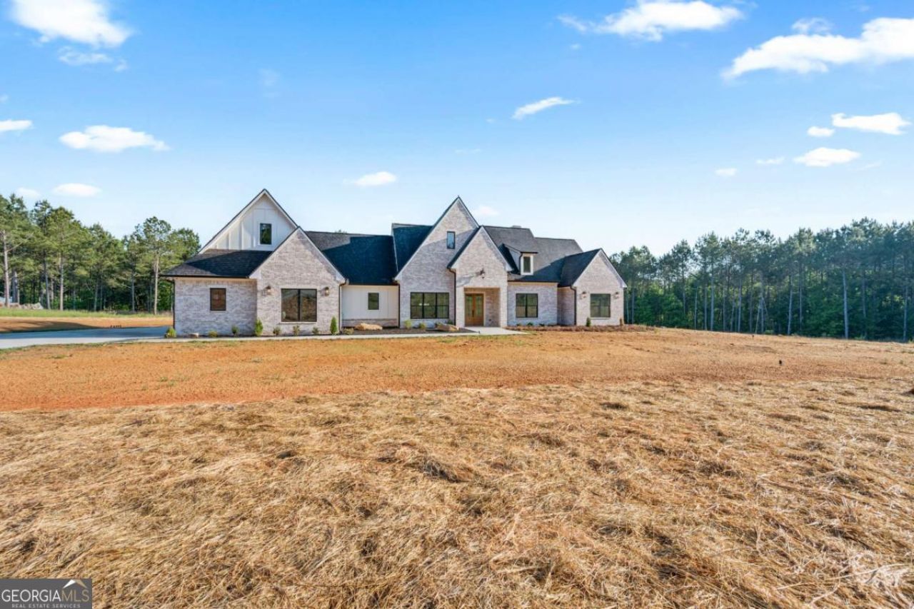 Experience refined country living in this stunning new construction home situated on 8.987 private acres in Nicholson, GA. Offering 2,893 square feet, this thoughtfully designed 4 bedroom, 2.5 bath residence combines luxury finishes with functional living spaces. A welcoming entry leads to a separate formal dining room, while the main living area showcases an open-concept design with soaring 10+ ft ceilings. The spacious family room is anchored by a wood-burning fireplace with a striking black accent wall, complemented by custom built-in cabinetry and shelving on either side. The kitchen is a true centerpiece, featuring an oversized natural wood island, quartz countertops, gas cook top with pot filler, double ovens, vent hood, and a well-appointed butler's pantry. A wet bar with built-in wine storage adds to the home's exceptional entertaining capabilities. The primary suite offers vaulted ceilings and abundant natural light, along with a spa-like bath complete with a double shower, dual vanities, dedicated makeup vanity, and a custom walk-in closet. The laundry room, equipped with a utility sink, conveniently connects directly to the primary closet. Throughout the home, all closets feature built-in wood shelving - no wire systems. Secondary bedrooms are thoughtfully positioned on the opposite side of the home, sharing a beautifully finished bathroom with a fully tiled shower. Enjoy outdoor living year-round on the expansive covered back porch featuring its own fireplace-perfect for relaxing or entertaining while overlooking the cleared yet private acreage. Additional features include a 3-car garage and quality craftsmanship throughout. This property offers the perfect blend of privacy, space, and modern design in a peaceful Nicholson setting.
